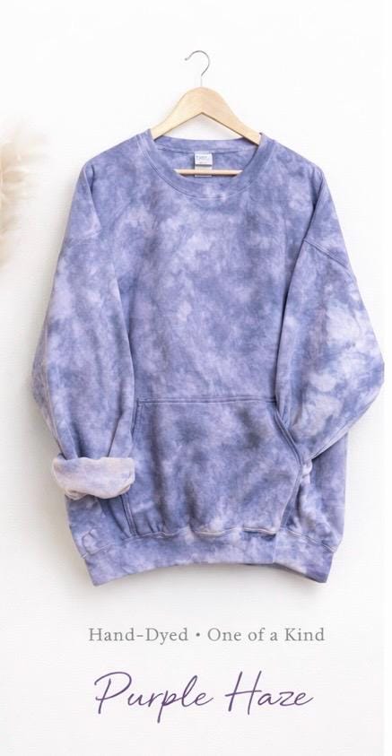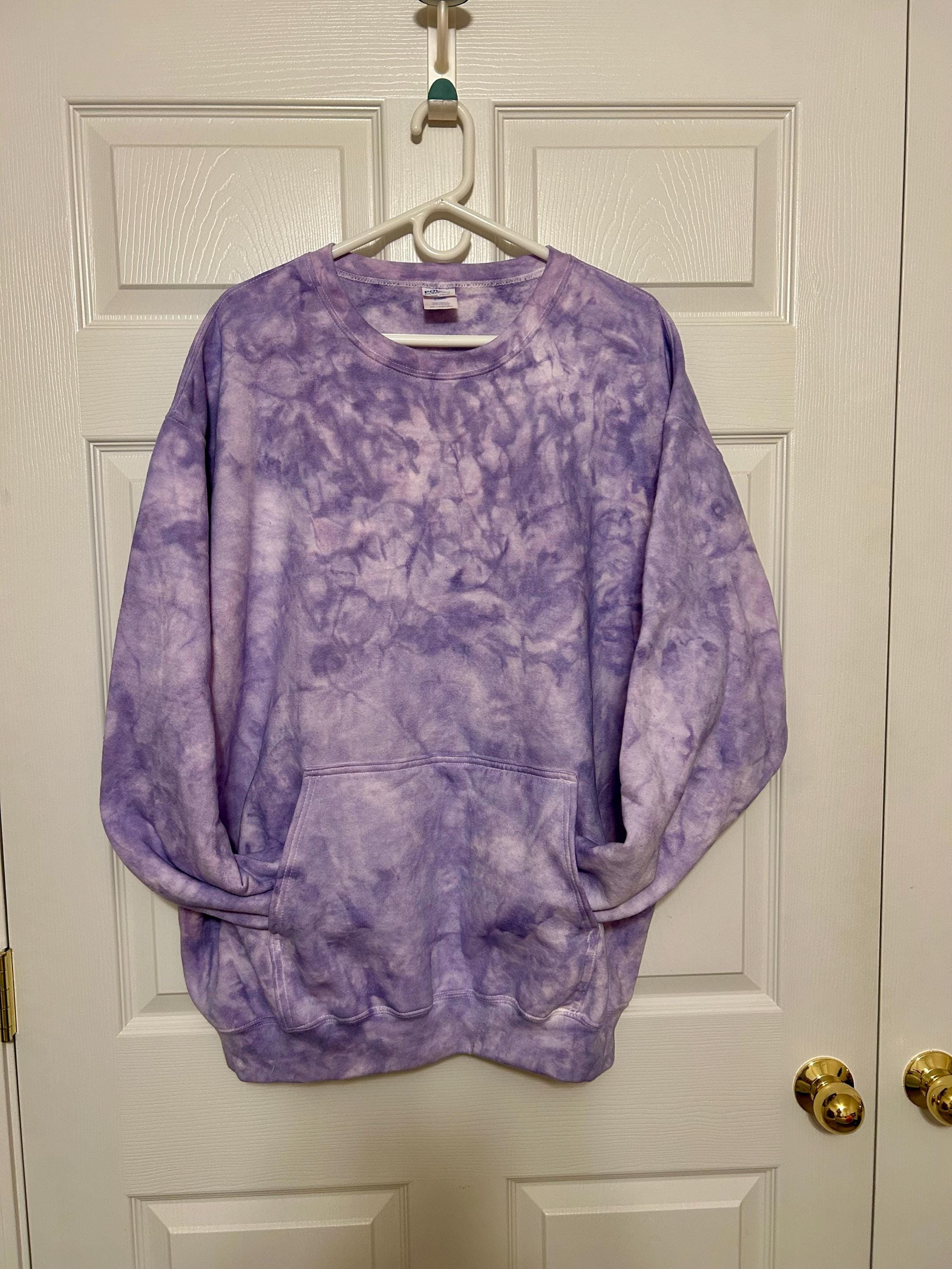 It's really beautiful- the purple is a bit deeper than pictured. I wear tie dye constantly and have about 30 tshirts but not many sweatshirts. I bought the 4xl and it looks roomy enough- though I wouldn't mind a 5xl option because I love my sweatshirts baggy. I LOVE the fact that it has the kangaroo pocket but not the hood. The style combined with the color is a huge win for me. This will be my new favorite, I'm sure!!!!!