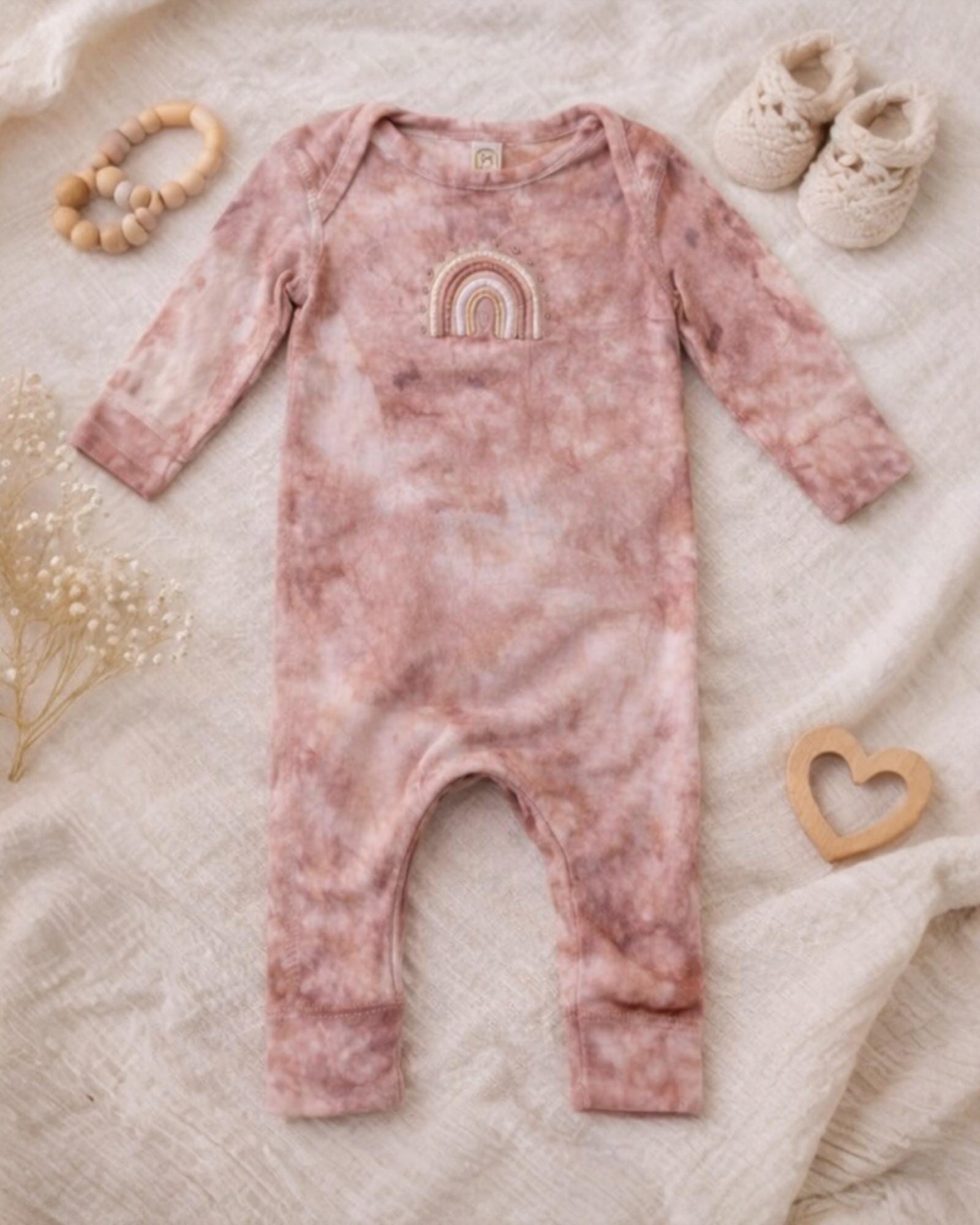 Made using the Rabbit Skins 4412 Infant Rib Coverall, this piece features a soft neutral tie-dye pattern with a sweet embroidered rainbow — timeless, cozy, and perfect for gifting.